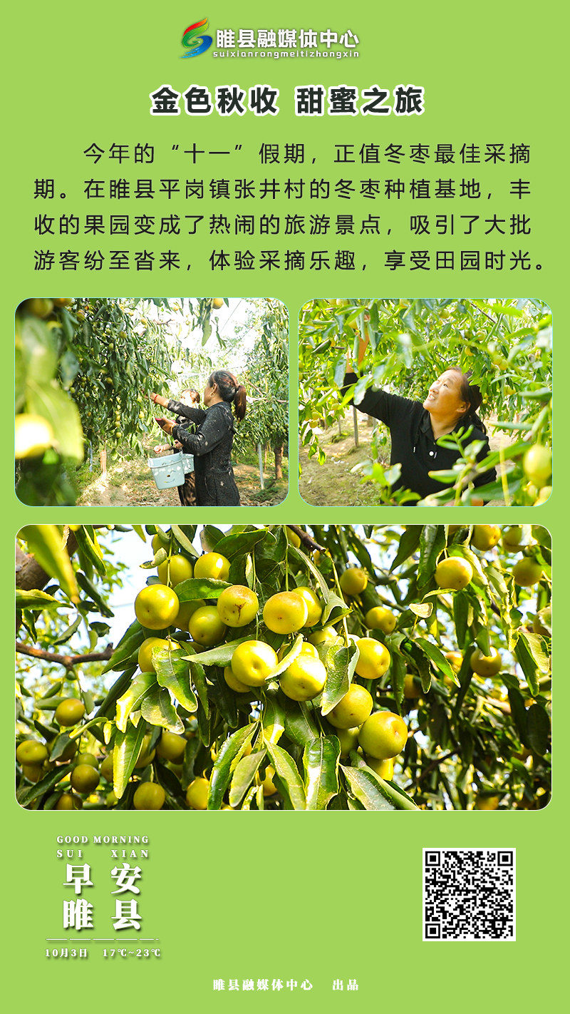 “听说平岗冬枣采摘园开了,跟俺老公来体验一下,国庆假期在家闲着也是闲着,”游客张玉娥一边摘一边笑着说,“以后不用跑远,带娃来这儿摘枣,还能体验绿色食品的快乐,太值了!”